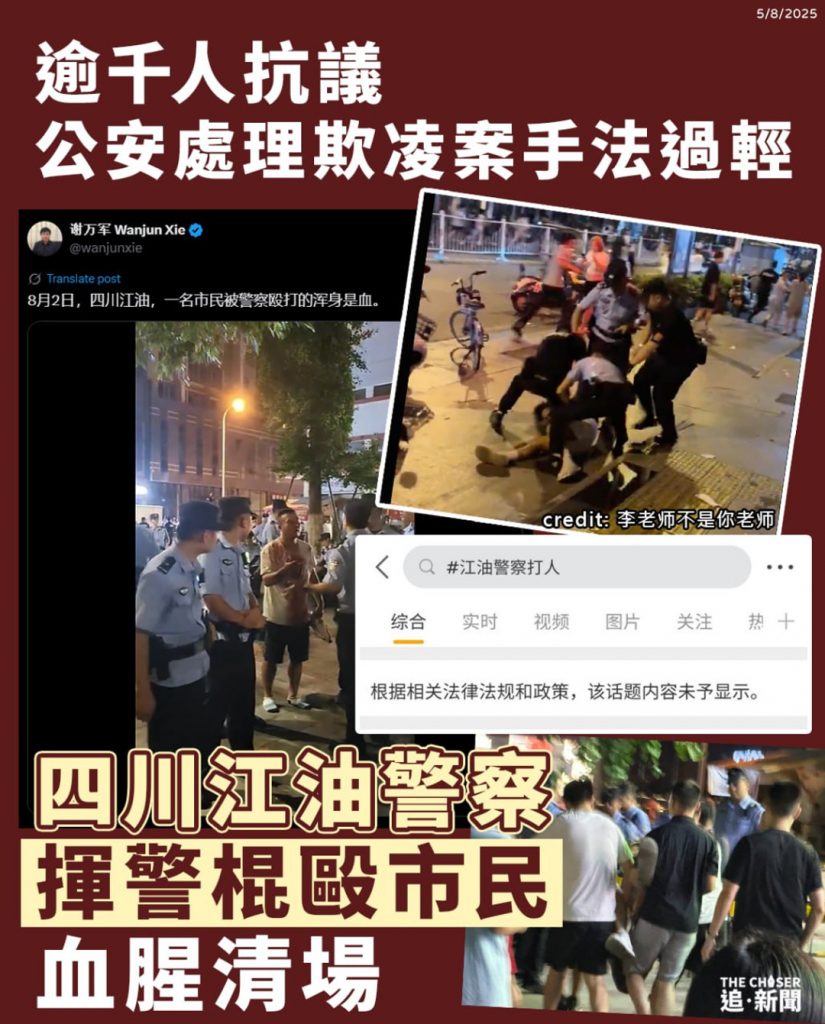 四川成都世界運動會周四(7日)揭幕前夕,毗鄰江油市逾千名群眾不滿公安對14歲女生遭欺凌案件處理手法過輕,周一(4日)在市政府辦公室前聚集抗議,與大批公安、黑衣特警對峙。警方翌日凌晨暴力清場,出動警棍、電擊棒毆打市民,現場據報留下斑斑血跡。網絡影片顯示,江油市面周二(5日)氣氛緊張,儼如戒嚴,道路被封,遍布警察,公安無預警邊拉人邊噴辣椒水,有相信便衣警察入夜後混入人群突然拘捕市民。當局亦據報大舉封鎖消息、實施網禁,部份地區無法用手機進行視像直播。