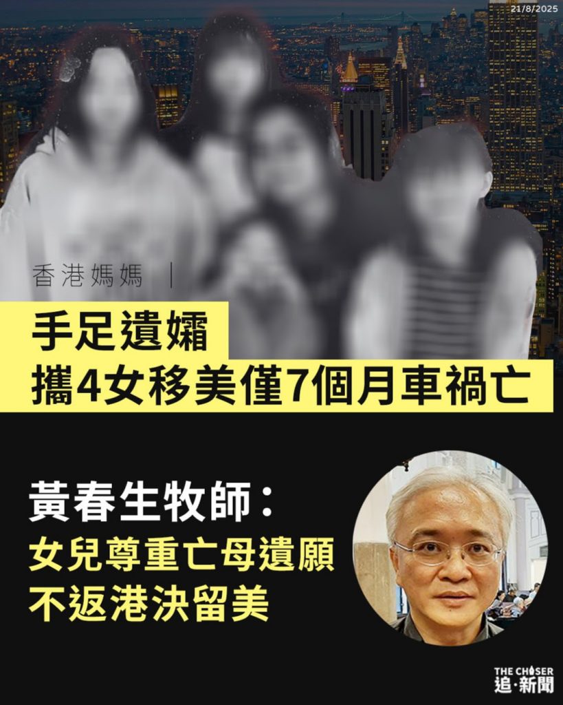 一名香港社運手足的遺孀今1月幾經辛苦終於帶著4名女兒從台灣以難民身份移居美國,近日卻在德州遇上車禍,當場喪生,遺下4名7至16歲的女兒。協助該名「香港媽媽」多年的台灣牧師黃春生周四(21日)向《追新聞》表示,4姊妹昨天一直哭,無法接受母親離世。他指出,女兒希望尊重媽媽的心願,因此不會返回香港,決定留在美國,希望可被同一家庭收養,4姊妹共同進退,不用各散東西。