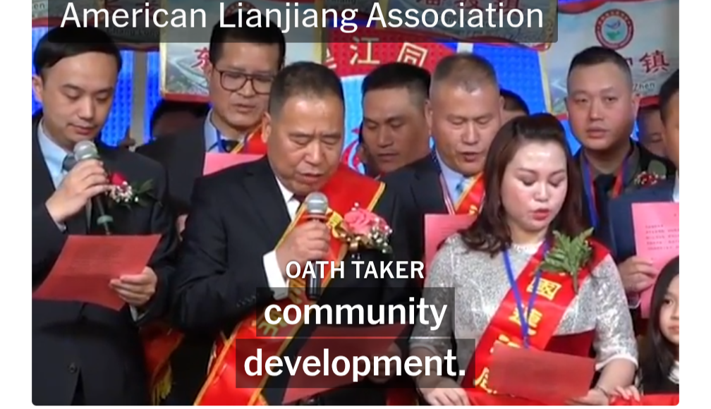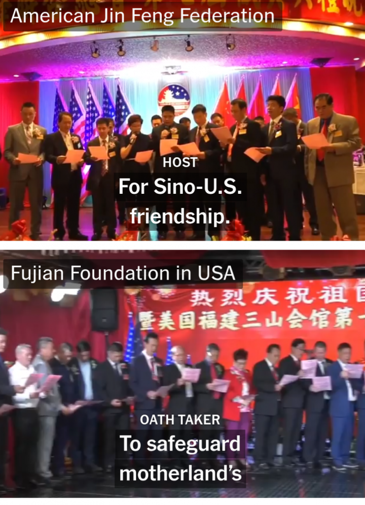 但据数十名同乡会的成员、政治人物及前检察官透露,许多同乡会已成为位于曼哈顿中城的中国领事馆的得力工具。一些同乡会负责人在中国有家人或生意,因此担心挑战其权威会惹祸上身。领事馆官员拉拢他们,让他们去恐吓那些支持台湾或越过北京其他红线的政治人物。曾有一位候选人同时成为中国情报人员和多位同乡会负责人的目标。