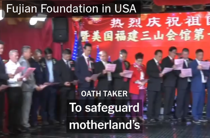 时报发现了一些领馆施加影响力的新证据。一些上传到YouTube的视频显示,领事馆官员在节日庆典中带领同乡会成员宣誓热爱祖国、捍卫祖国利益。有时他们宣誓要促进与台湾的“统一”,台湾是一个自治的民主岛屿,中国意在将其并入大陆。