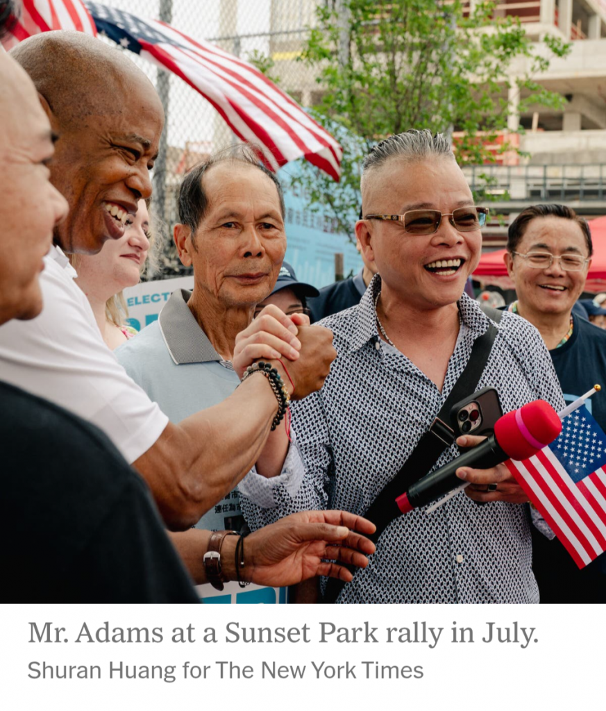 Mayor Eric Adams speaking into a red microphone with a campaign sign behind him containing Chinese characters. 埃里克·亚当斯市长7月在布鲁克林日落公园举行的一场竞选集会上。Credit…Shuran Huang for The New York Times