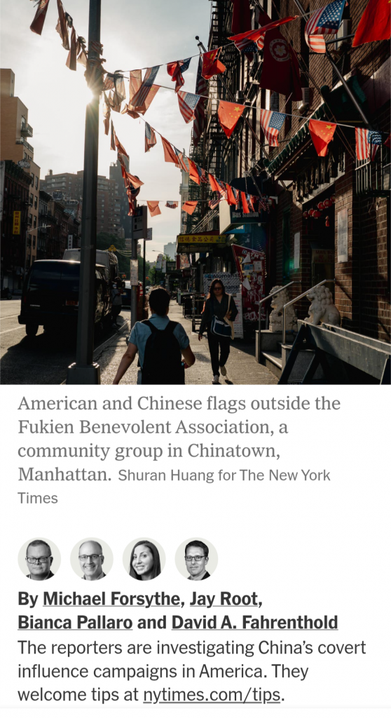 《纽约时报》发现,在过去五年中,超过50个与北京有联系的组织动员成员为政治候选人筹款或背书。其中许多是非营利慈善机构,而法律禁止这样的机构参与助选活动。