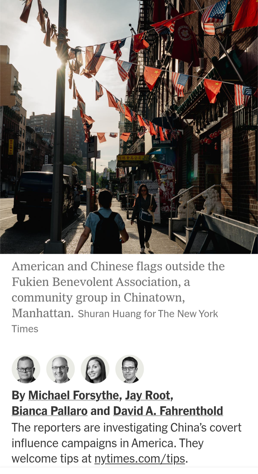 中国的影响力机器堪称全球最庞大、最高效的运作体系之一。数十年来,它在法国骚扰流亡者,在英国贿赂学者,并在加拿大把特定政治人物作为打击对象。它甚至在多国设立秘密警察站点威胁异见人士。在有60万华裔人口的纽约市,其运作尤其见效——当地政府部门屡次曝光同乡会组织扮演的不法角色。