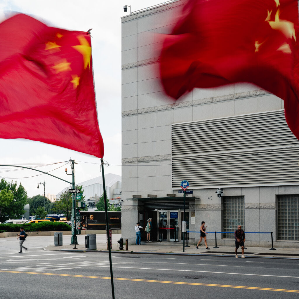 纽约中城中国总领事馆外的旗帜。Credit…Shuran Huang for The New York Times