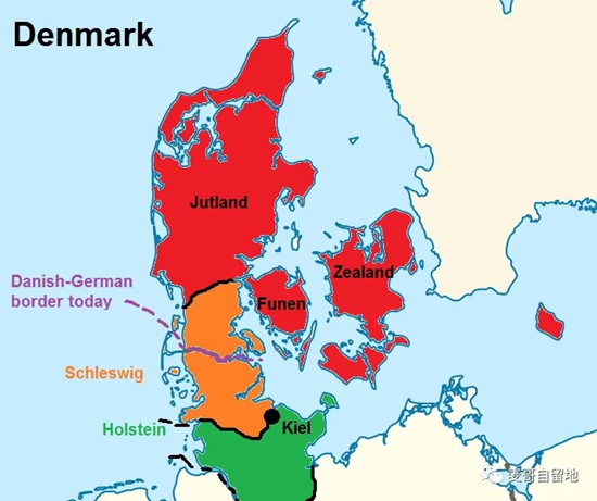 还有两个公国构成了丹麦和德国(其实当时还没有统一为德国)之间的边界地区:石勒苏益格(Schleswig)和荷尔斯泰因(Holstein)。严格来说,石勒苏益格-荷尔斯泰因并不是丹麦的一部分,而是丹麦国王的个人领地。