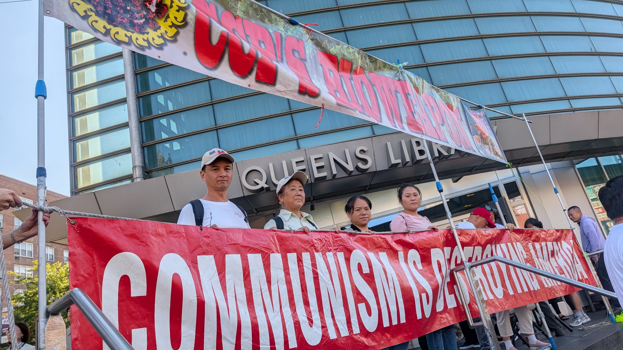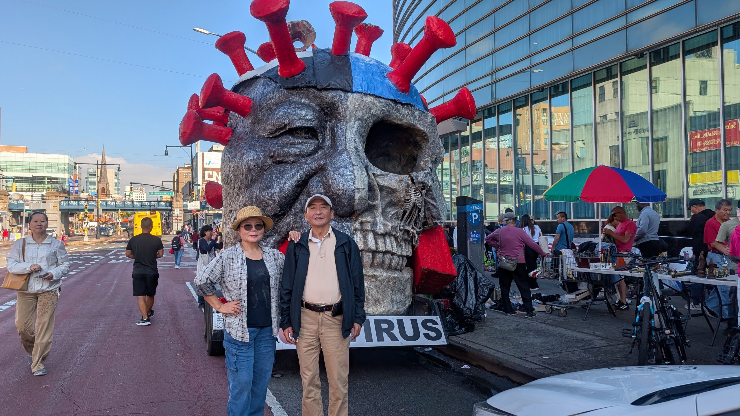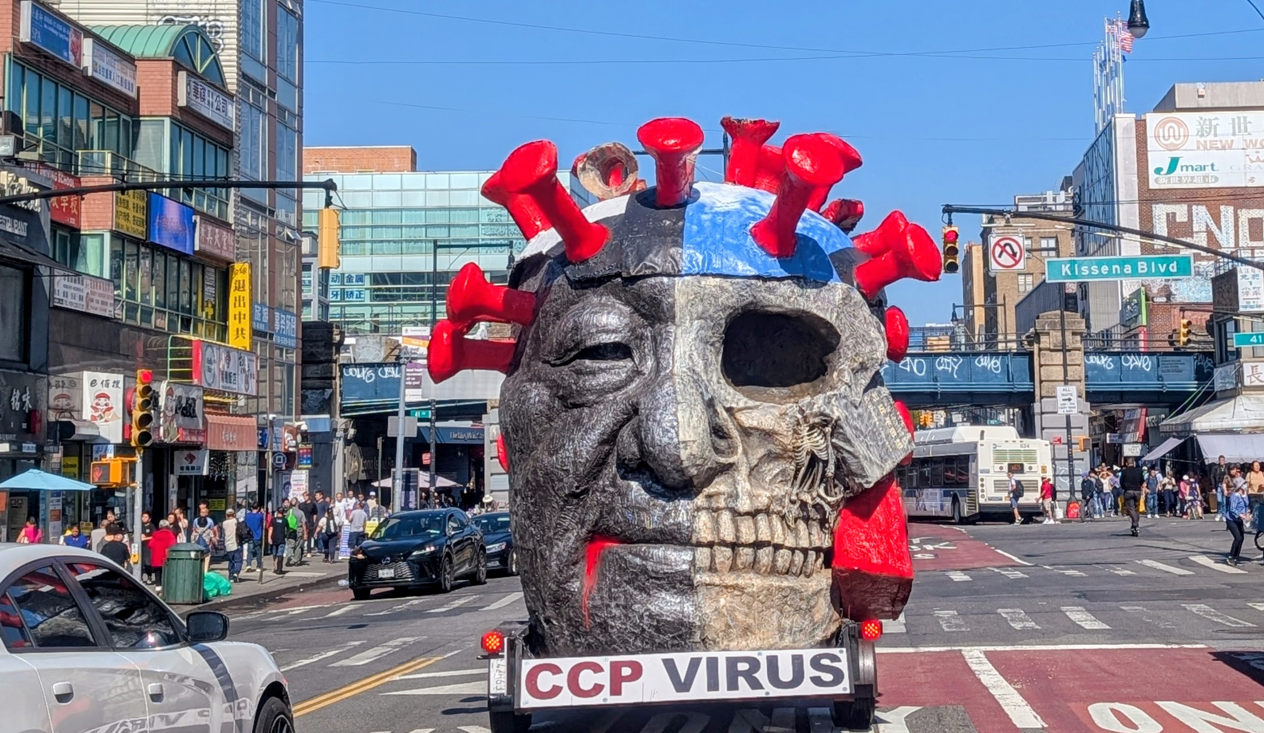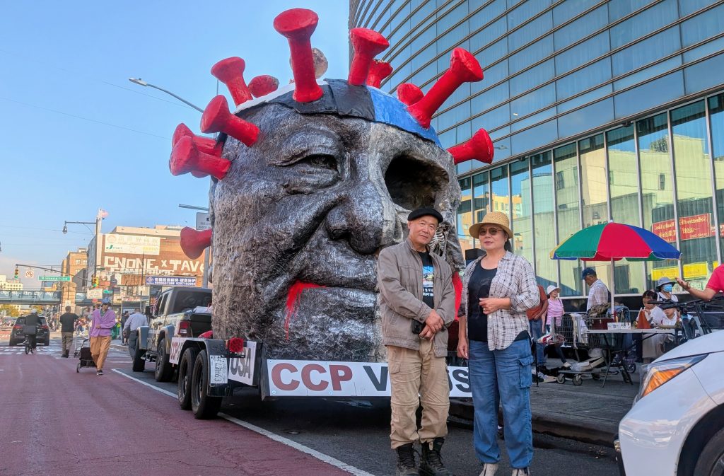 2025年9月28日习近平病毒雕像在纽约华人聚居地的法拉盛市中心地带巡游。