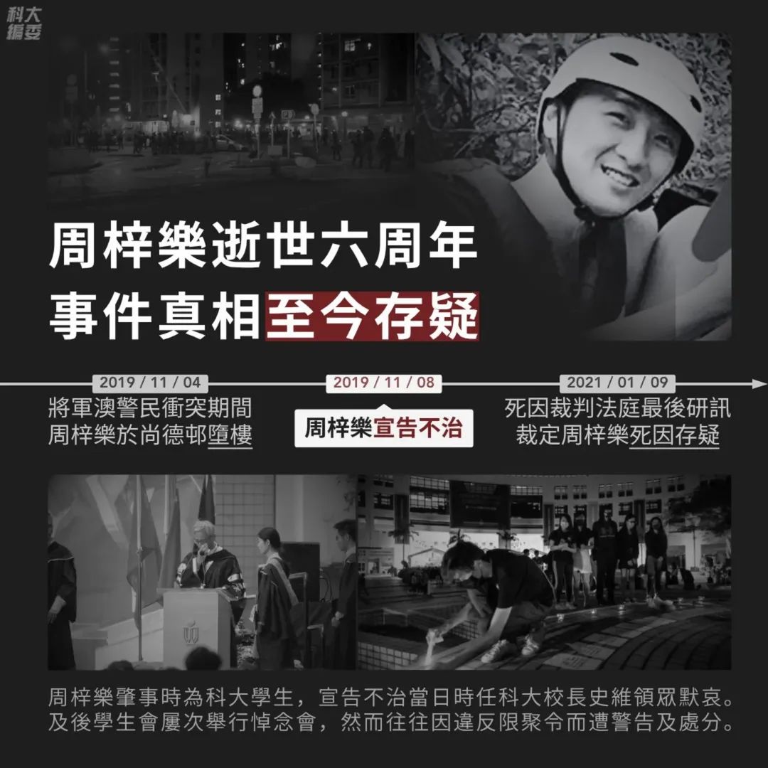 6年前的2019年11月4日凌晨,科大計算機科學系學生周梓樂在將軍澳警民衝突期間,在尚德邨停車場的三樓跌下二樓重創,送醫昏迷期間被發現有腦出血及盤骨碎裂的情況。四日後宣告不治,終年22歲,成為首位在2019年反修例運動現場附近受傷並喪命的人。