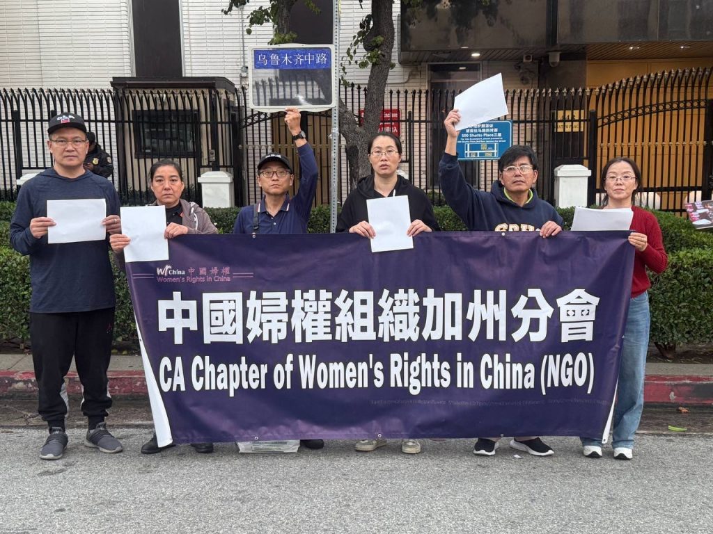 图为中国妇权义工2025年11月23日来到洛杉矶中领馆前,纪念白纸运动三周年。左起:徐世刚、刘文霞、戈冰。右起:张志娟及苏尚伟。(图片:中国妇权)