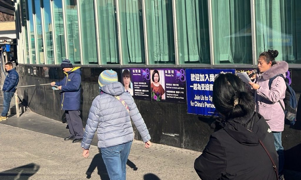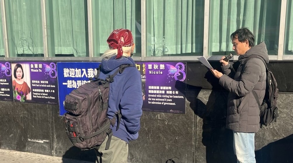 李恒真向路人讲叙香港返送中勇者的故事。(图片:中国妇权周梅)
