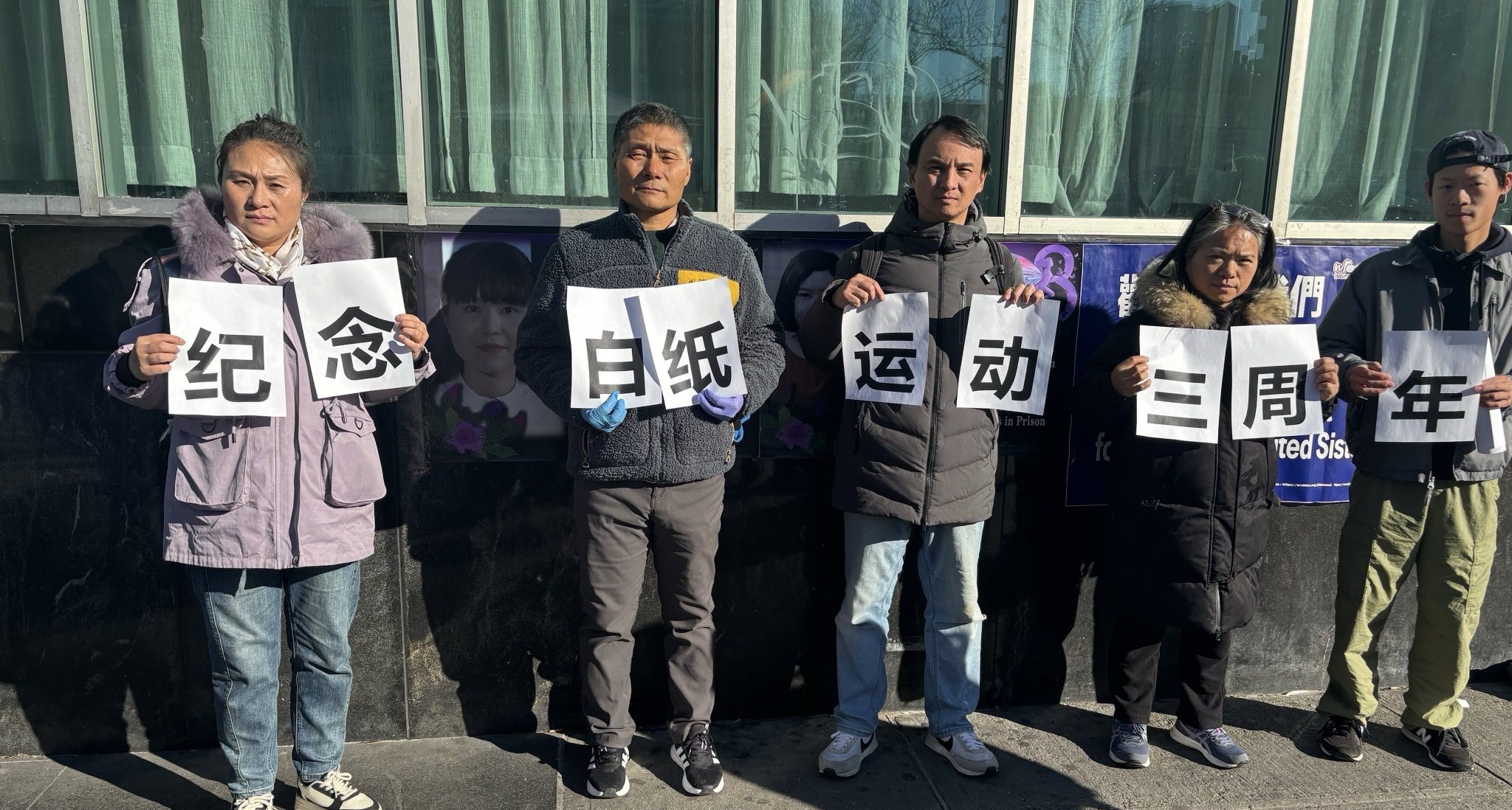 中国妇权会员2025年11月29日在纽约法拉盛公共图书馆旁手举白纸,纪念白纸运动三周年。(中国妇权蒋鼎成)