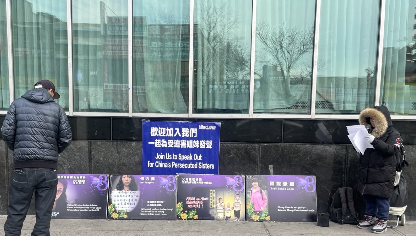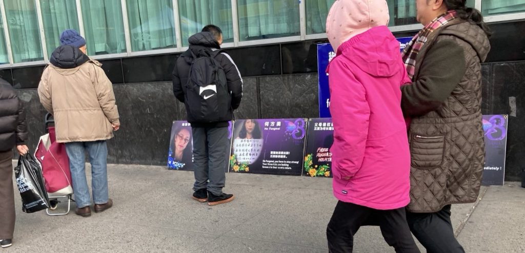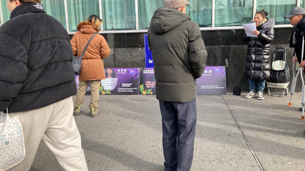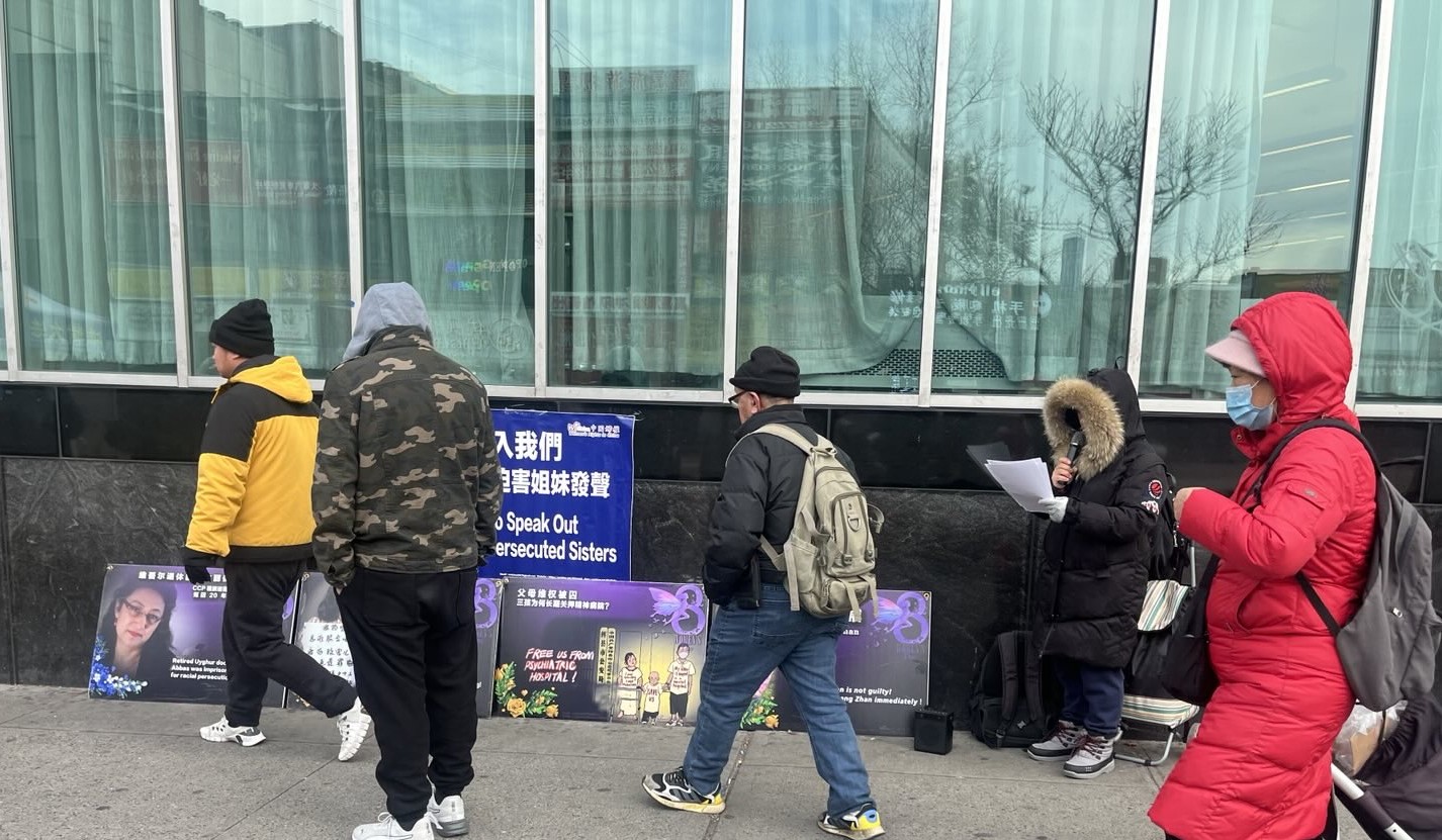张艳(右)通过麦克风大声讲述何方美(横幅右二,右三为她的三个曾被拘押在精神病院的未成年孩子)的故事。周梅摄于2025年12月13日于纽约法拉盛图书馆外。(WRIC)