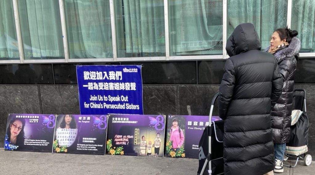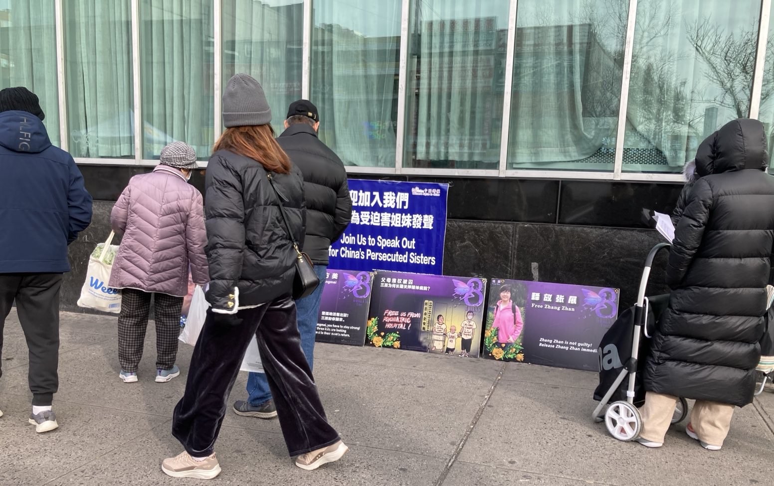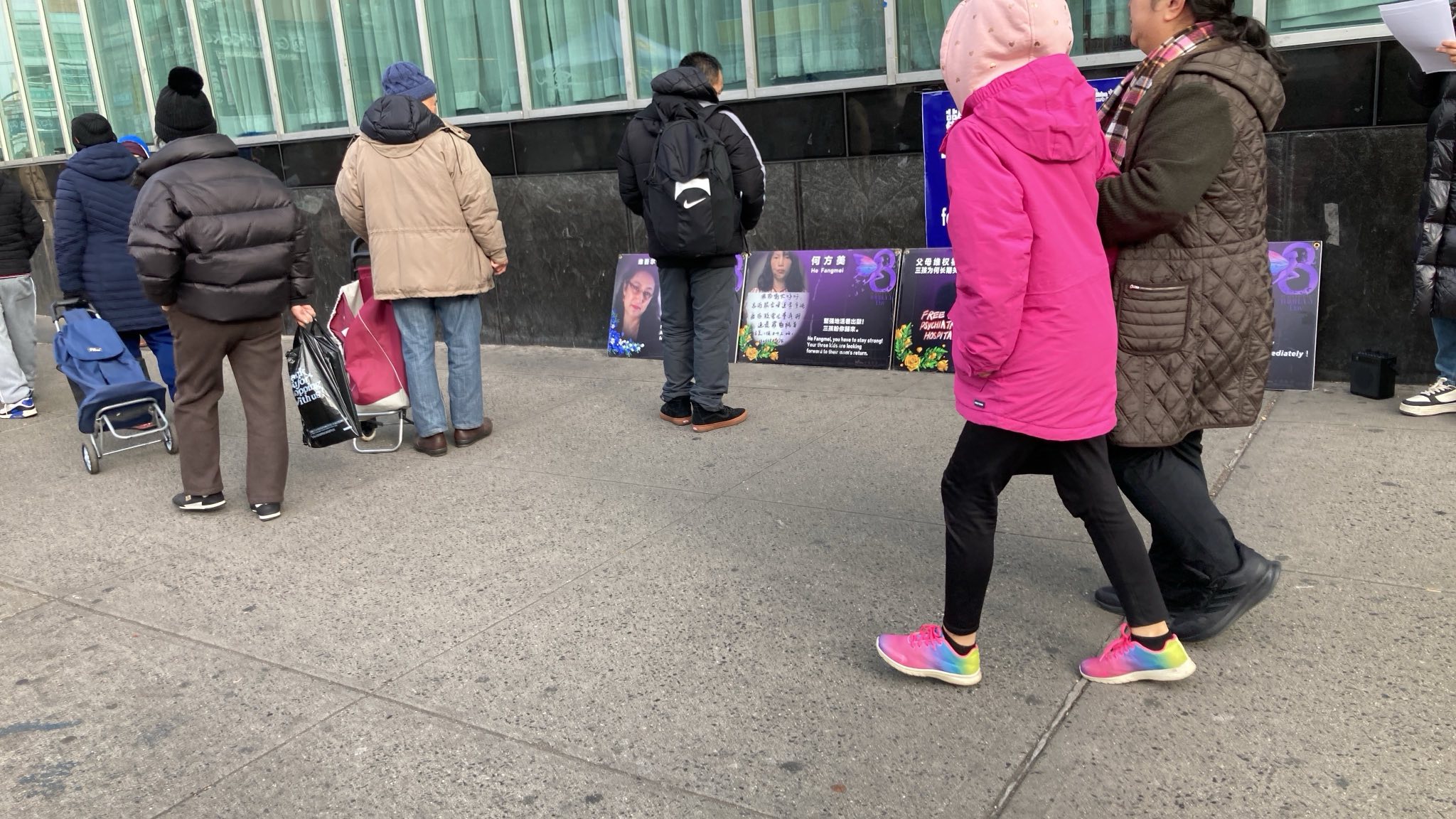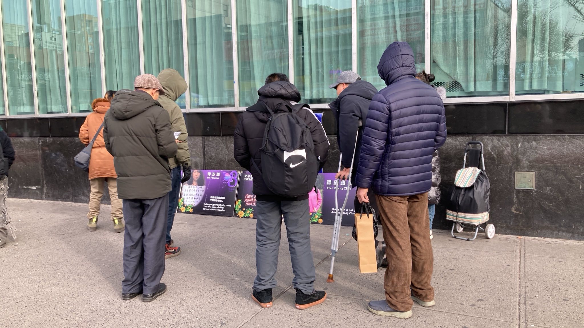 图片中横幅左一为维吾尔医生古丽仙医生。张艳摄于2025年12月13日于纽约法拉盛图书馆外。(WRIC)