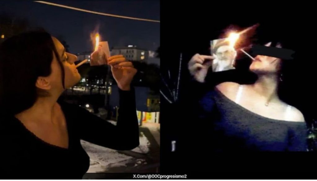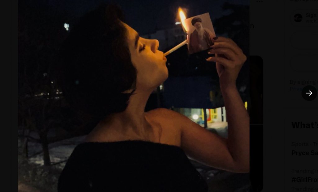 Iranian woman lights her cigarette with a burning photo of the ayatollah. This is braver than anything an American feminist has done in the 21st century. Actual badass: pic.twitter.com/1nzV4lmwOh