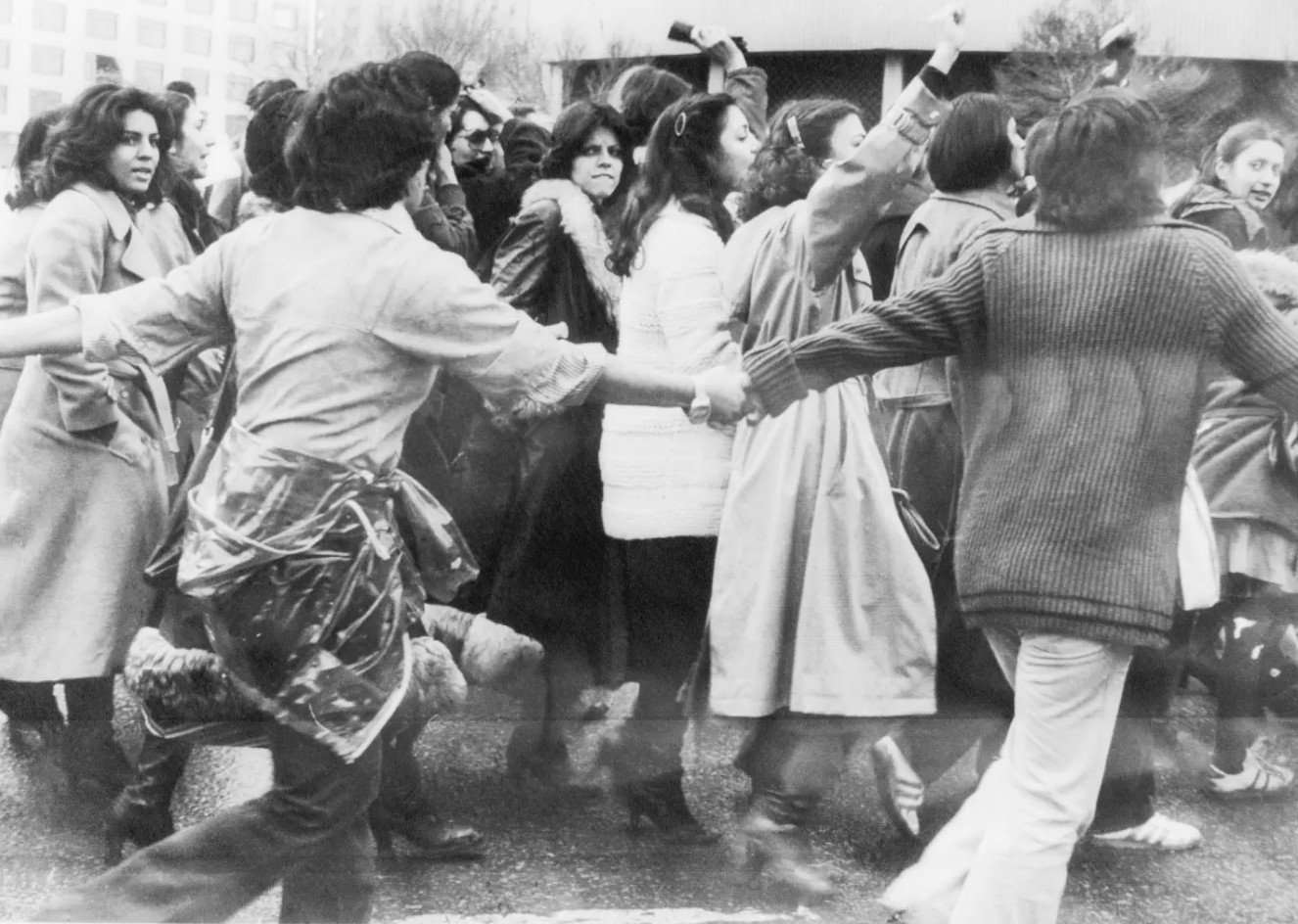 1979年3月10日,德黑蘭女性抗議者在男性的保護下遊行,反對面紗。 Bettmann-ArchiveGetty