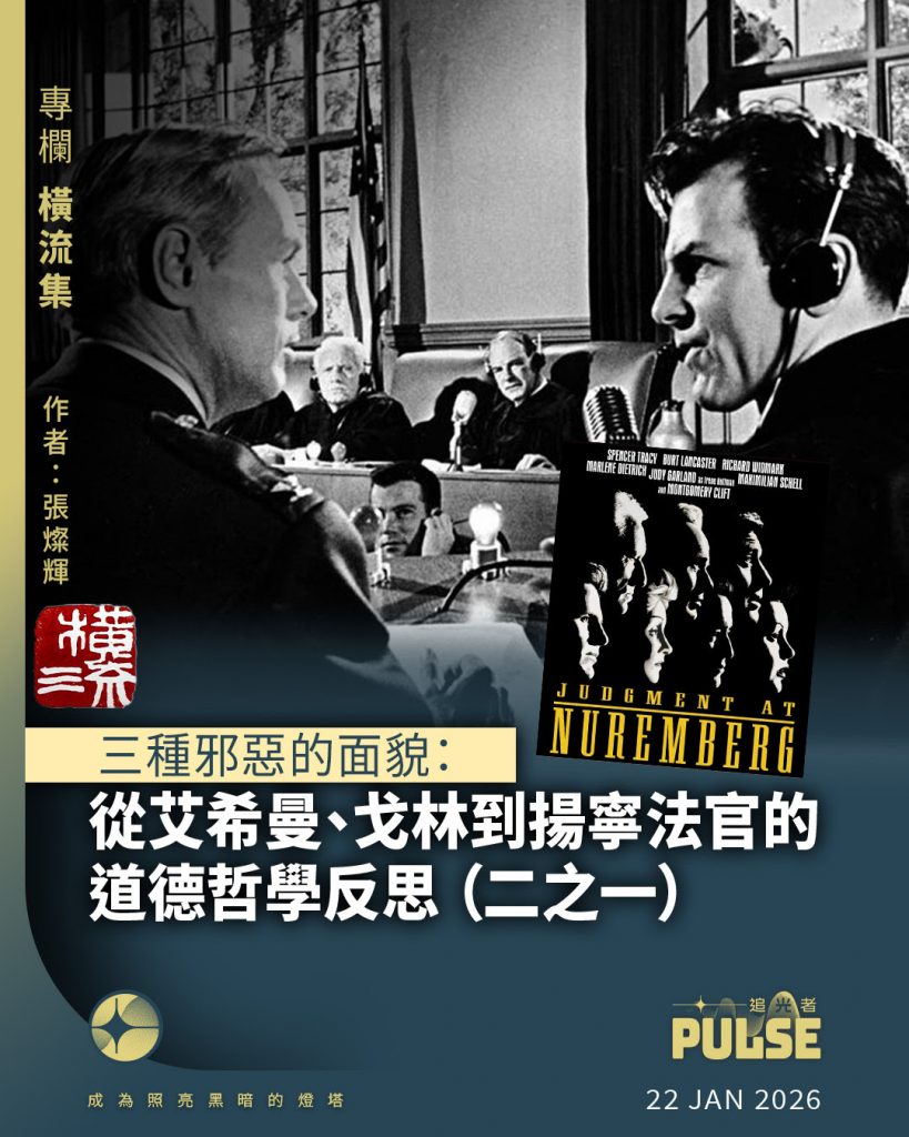 當我們試圖理解二十世紀最黑暗的歷史篇章時,「邪惡」這個概念往往顯得過於單薄,無法承載納粹暴行所呈現的複雜人性圖景。鄂蘭(Hannah Arendt)在耶路撒冷審判艾希曼(Adolf Eichmann)時提出的「平庸之惡」(Banality of Evil)概念,徹底顛覆了傳統對邪惡的理解——邪惡不必然來自惡魔般的意志,而可能源於思考能力的徹底缺失。然而,艾希曼所代表的僅是邪惡光譜中的一端。戈林(Hermann Göring)作為納粹政權的二號人物,展現了另一種截然不同的邪惡形態:他聰明絕頂、深諳權謀,完全清楚自己在做甚麼,卻依然選擇走向深淵。而1961年克雷默(Stanley Kramer)執導的電影《紐倫堡大審判》#(Judgement at Nuremberg 1961)則揭示了第三種更為幽微的邪惡:法學教授出身的簡寧法官(Ernst Janning),一個曾經備受尊敬的法律權威,如何在納粹體制下成為司法謀殺的共謀者。