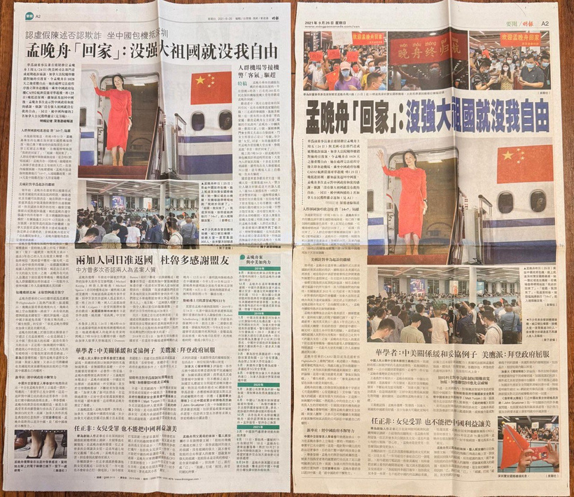 加拿大《明報》(圖右)將特稿及時序移走,改而在頁頂加插三張深圳群眾熱情接機,製造「祖國強大」氣氛。加上時序提及的罪狀不見了,突顯孟晚舟「自由了」。另外,頁底取走電子腳鐐相,再補一張重覆的接機相,中間兩張相片擴大將版面填滿。如此操作實在難看!
