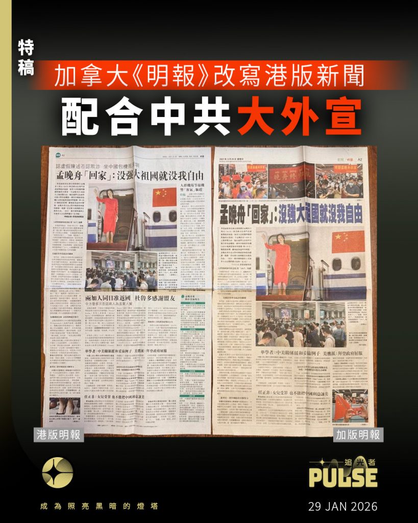 加拿大《明報》配合中共大外宣 改寫港版新聞