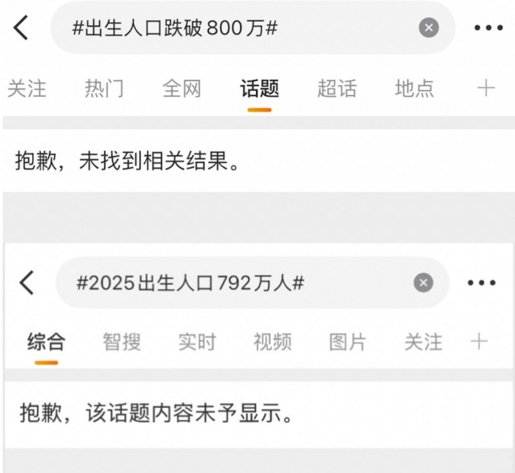 与此同时,中国数字时代注意到,微博热搜榜未出现“出生人口为792万”等相关话题,知乎上则出现大量相关问答被删除的情况。推特用户@李老师不是你老师 称“出生人口跌破800万”、“2025年出生人口792万人”等词条遭到屏蔽。讽刺的是,“2025年GDP增长5%”、“人民日报评美国斩杀线”、“中国GDP跨越140万亿元关口”等话题却疑似被人为推上热搜,上演了掩耳盗铃的一幕:最该被看见、被讨论的人口危机反而被遮住。一个国家的出生速度下滑得如此之快,这种坠落背后的社会与经济成因,非常有必要被正视与讨论。有网友指出,出生率是一个社会幸福感受和经济情况的直观体现,当“大人们哭声多了,小孩的哭声就少了”,这是无论怎么宣扬经济向好、美国很糟也解决不了的根本困境,因为生与不生从来就不是什么口号之争。