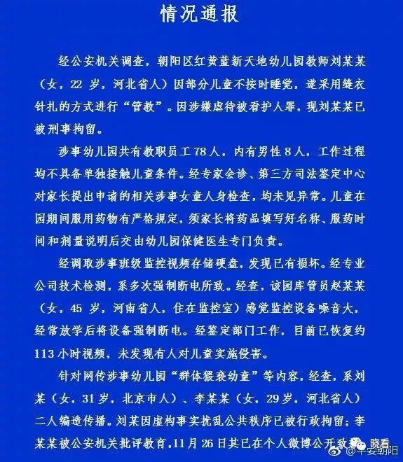 果然,朝阳警方的第一份情况通报称今日涉事幼儿园教师刘某某因涉嫌虐待被看护人罪已被依法刑事拘留,公安机关正在进一步工作中。在第二份情况通报中,朝阳警方称,11月23日,警方经工作将行为人刘某抓获。该人对自己编造“老虎团”人员集体猥亵幼儿虚假信息,后通过微信群传播的违法事实供认不讳,并对造成的不良影响深表悔恨。