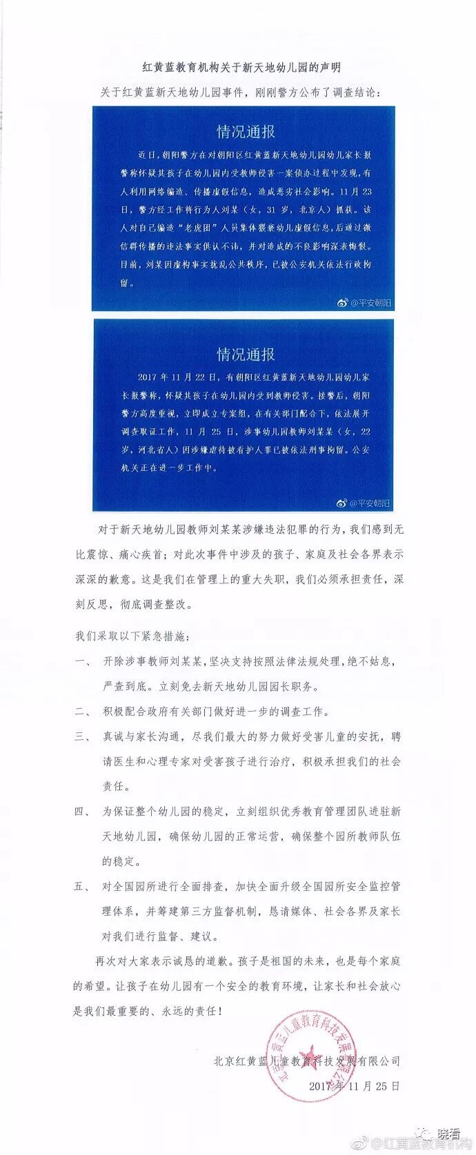 ——而就在新天地幼儿园虐童事件略有平息之时,11月27日,有沧州市运河区红黄蓝幼儿园家长报警称,怀疑其孩子在幼儿园内受到侵害。接警后,运河公安分局高度重视,立即成立专案组,依法开展调查取证工作。目前,公安机关正在进一步工作中。区教育部门对幼儿园进行暂时闭园处理,对有转园需求的幼儿安置到运河区两所公办幼儿园。
